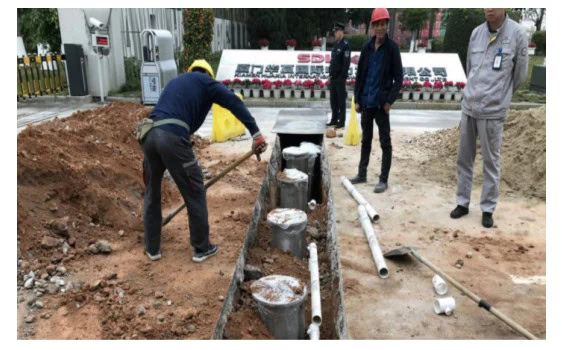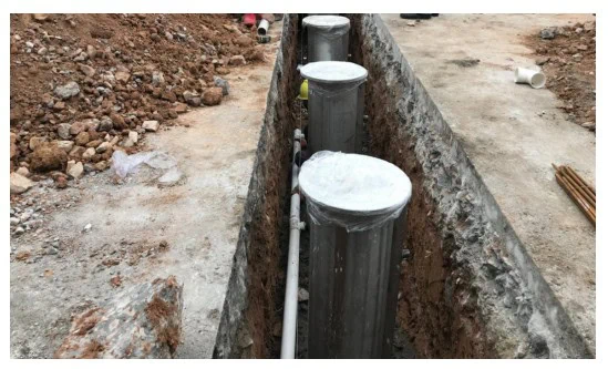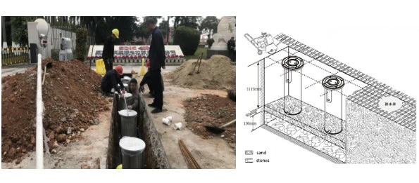 (6) Embed drainage pipes according to the pre-reserved drainage holes on the outer sleeve surface, connecting them to the drainage well. First secure the bollards with sand and gravel. Embed conduit pipes. Connect 90-degree pipes to the bottom drainage pipes of the bollards, positioning the pipes downward (natural seepage method). Use tee fittings and straight pipes to connect each bollard, routing the pipes to a storage tank (requires separate construction) or sewer system.