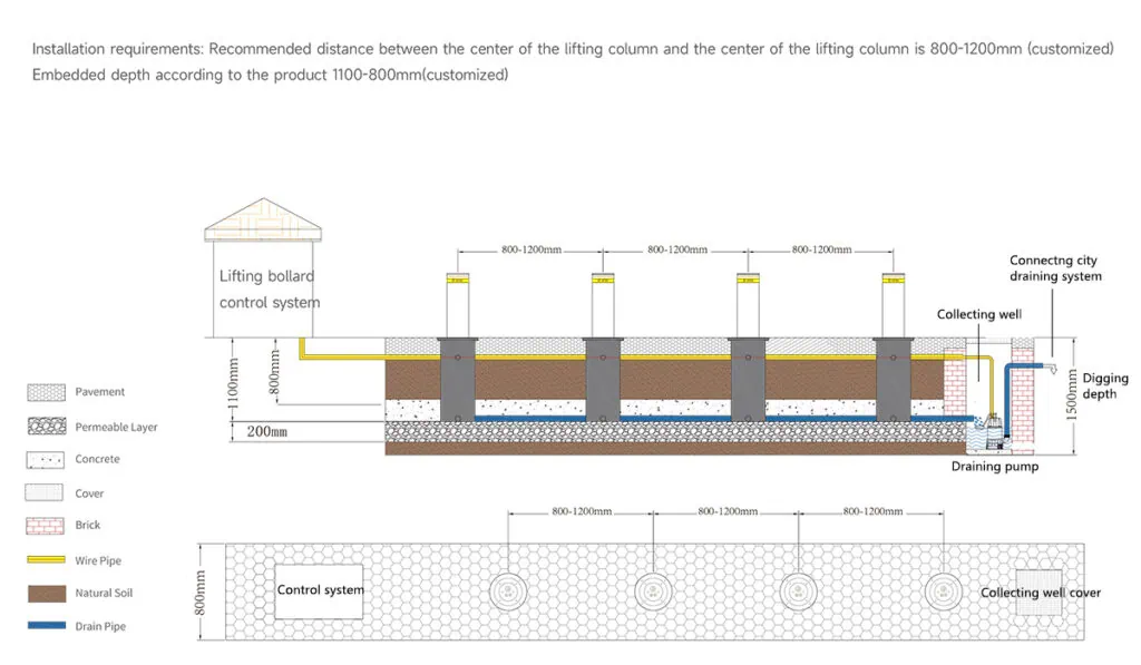 (4) Foundation pit dimensions: Width 80cm, depth 100cm, length determined by on-site road conditions. After excavation, create a drainage layer by sequentially laying a 200mm crushed stone layer and a 100mm crushed sand layer at the base. Level and compact the drainage layer to prevent bollards sinking. If conditions permit, use crushed stone smaller than 10mm to omit the sand layer. Determine whether to install a drainage system based on local conditions. Connect the drainage pipe from the bottom of the bollard’s pressure relief chamber to a 90-degree PVC pipe, with its outer opening facing the ground to direct accumulated water into natural underground drainage.