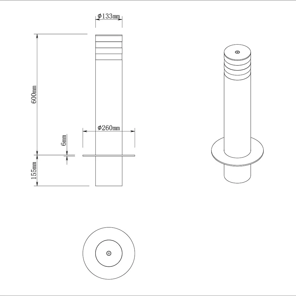 Feature ● Intercept Height: 600mm(customized) ● Diameter of Bollard: 133mm(customized) ● Thickness of Bollard: 6mm(customized) ● Customization available ● Stainless Steel Material ● Galvanized Coating